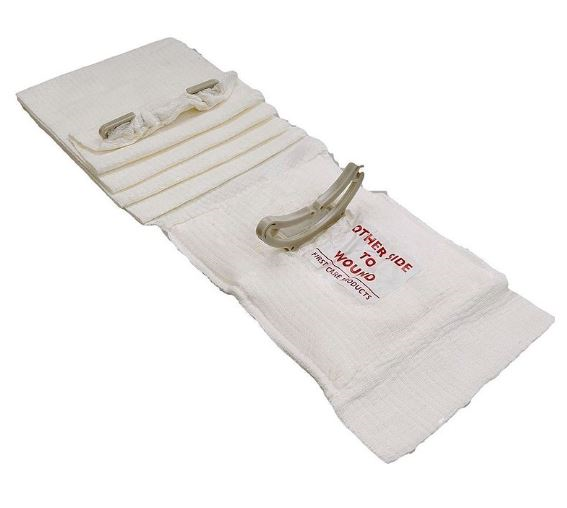 Der Verband verfügt über eine saugfähige Wundauflage welche nicht mit der Wunde verklebt und durch den eingearbeiteten Druckbügel ist ein seperater Druckkörper nicht nötig. Dies führt zu keinem Zeitverlust bei starken Blutungen und der Anlage von einem Verband und auch in stressigen Situationen ist eine sichere Anlage möglich - besonders bei stressigen Siuationen ist der durchgenähte Faden von entscheidendem Vorteil, da dieser ein unbeabsichtiges Abrollen der Bandage verhindert.