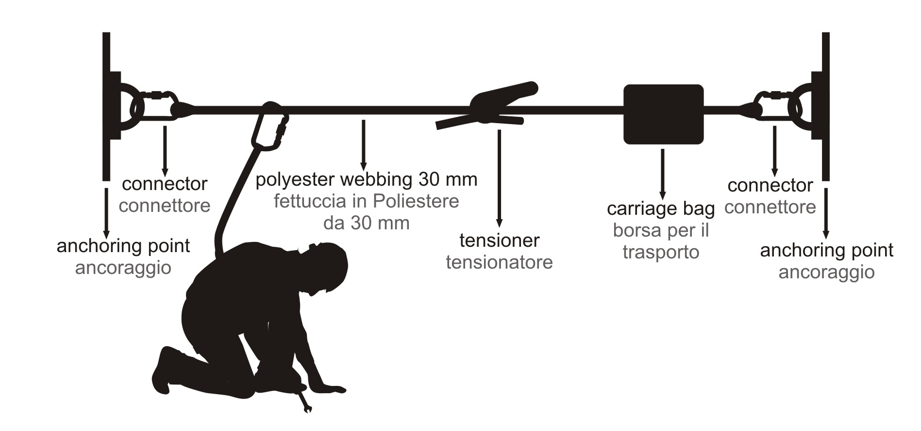 Lifeline für horizontale Verfahren, einfacher Aufbau, mit 30 mm breitem Polyester-Gurtband, geeignet für Schwerlasten, hohe Sichtbarkeit.